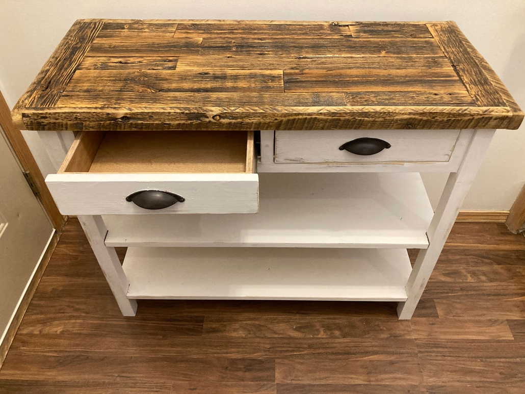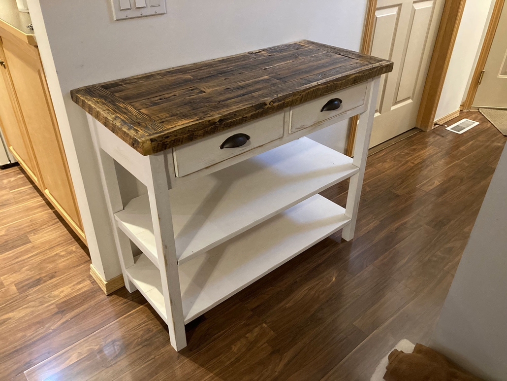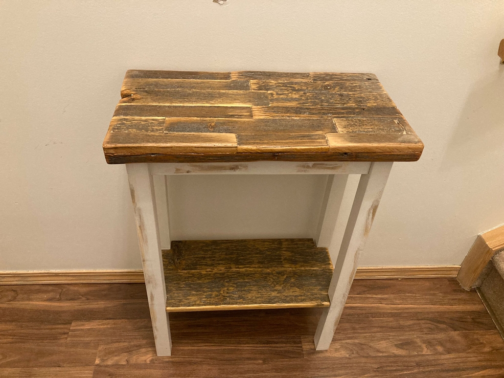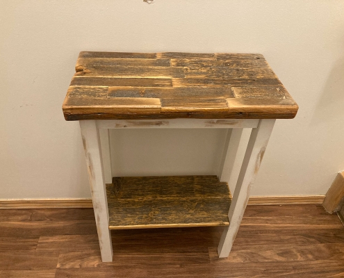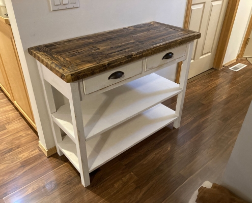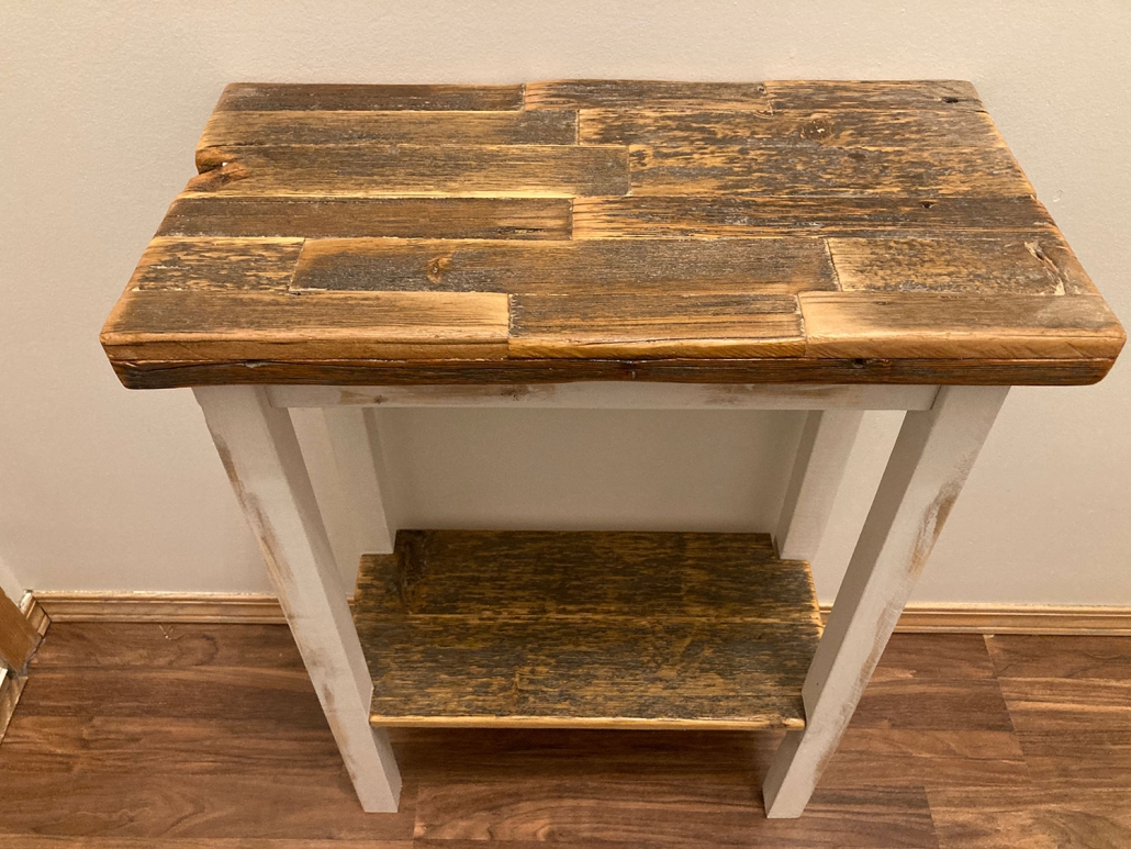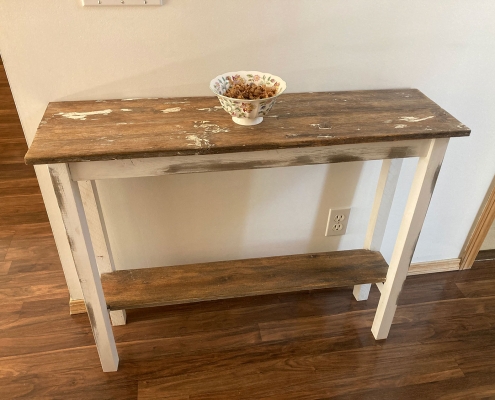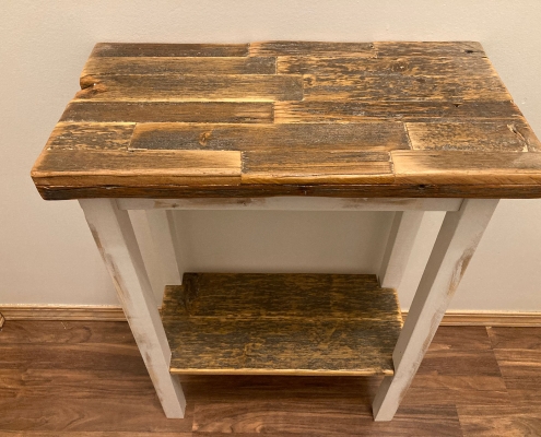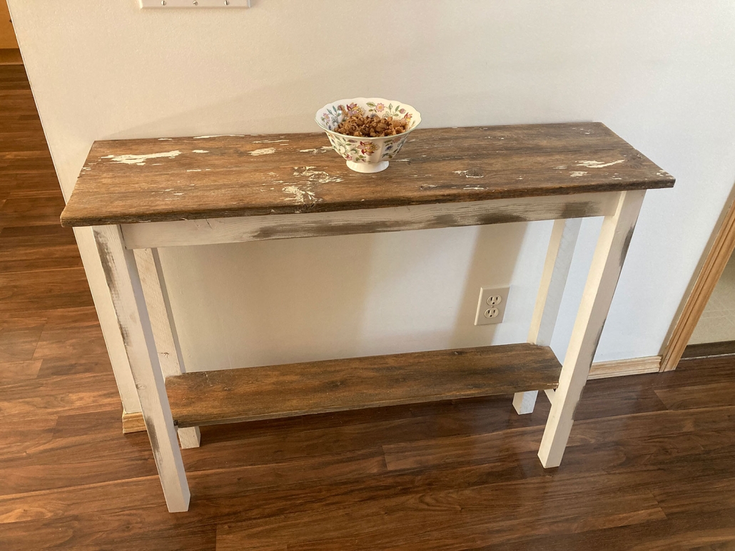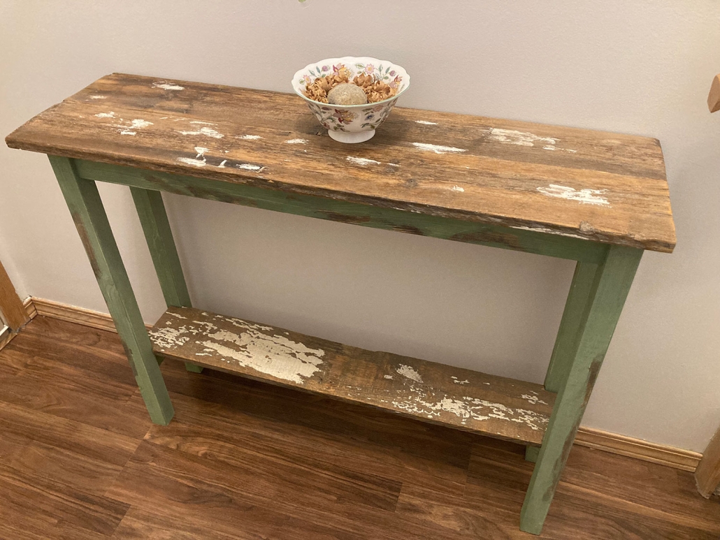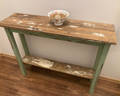Hall or entrance table – this is built with a combination of solid and reclaimed wood. It has a top and bottom shelf for your decorative pieces. The reclaimed shelfs are finished with clear polyurethane and the legs are finished with distressed paint. Measures 36” L, 10” D, 30” H